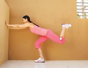 Zatim. Oslonite se na naslon stolice (ustajte, ustajte... sada smo u stojećem položaju) i jednu nogu opružajte iza sebe, blago savijenu, visoko gore. Opružajte je polako tako da odbrojite do 4, pa spustite ali ne skroz na zemlju. Neka noga ostane u vazduhu blizu zemlje. 10 x jedna noga 10 x druga noga.